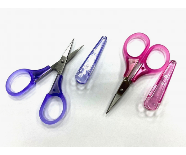Up for sale is quality embroidery scissors with plastic handles in blue, purple and pink colours, 2 pairs each colour. They come with matching colour sheath.