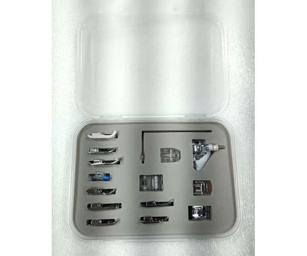 This is a set of 14 essential snap-on presser feet, a quilting guide bar and a hard plastic stackable carrying case for the sewist of any skill level. Included feet are Non-Stick Foot, Open Toe Foot, Quilting/Straight Foot, Sew-on Button Foot, Zipper Foot, Invisible Zipper Foot, Hemmer Foot, Blind Stitch Foot, Cording Foot, Overcast Foot, 1/4" Patchwork Foot, Gathering Foot, Pintuck Foot (5 Groove) and a Roller Foot.