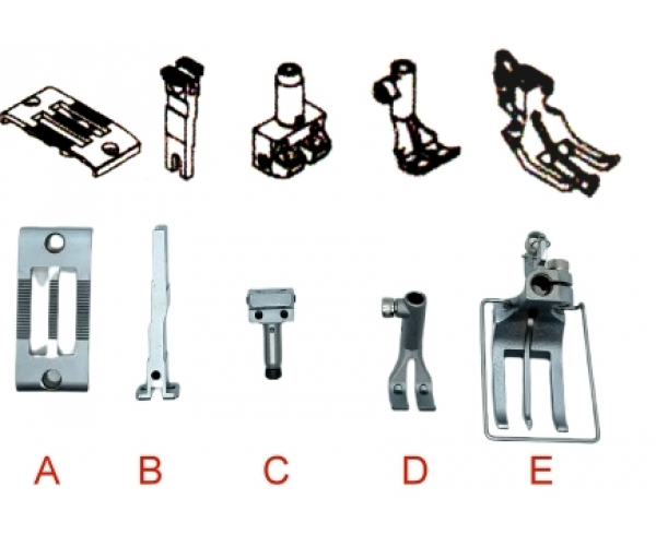 Complete gauge set 7-piece. Each consists of center guide outside foot, inside foot, needle plate, feed dog, needle clamp and feed lever base cover (x2)